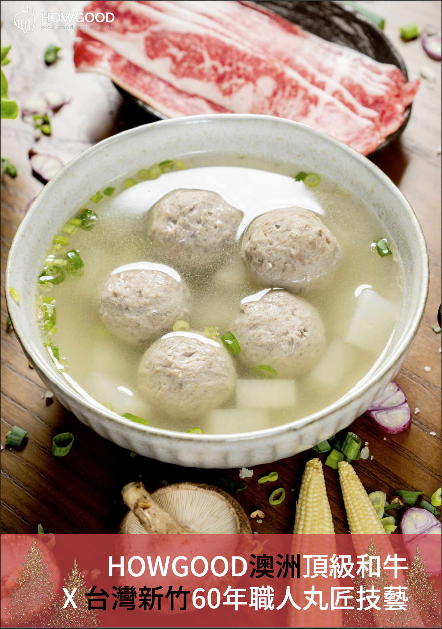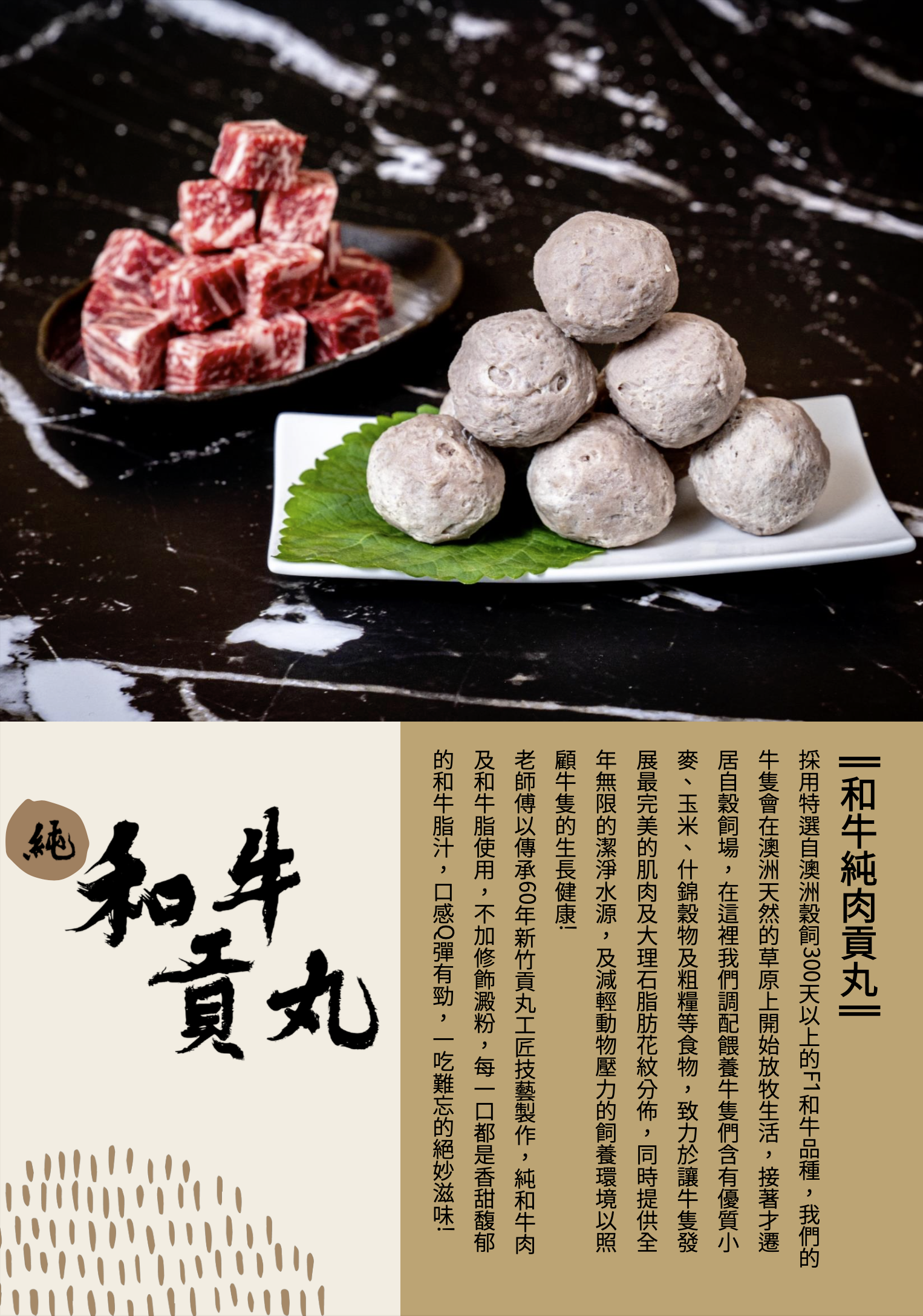 採用特選自澳洲穀飼300 天以上的F1 和牛品種,我們的牛隻會在澳洲天然的草原上開始放牧生活,接著才遷居自穀飼場,在這裡我們調配餵養牛隻們含有優質小麥、玉米、什錦穀物及粗糧等食物,致力於讓牛隻發展最完美的肌肉及大理石脂肪花紋分佈,同時提供全年無限的潔淨水源,及減輕動物壓力的飼養環境以照顧牛隻的生長健康! 老師傅以傳承60 年新竹貢丸工匠技藝製作,純和牛肉及和牛脂使用,不加修飾澱粉,每一口都是香甜馥郁的和牛脂汁,口感Q 彈有勁,一吃難忘的絕妙滋味