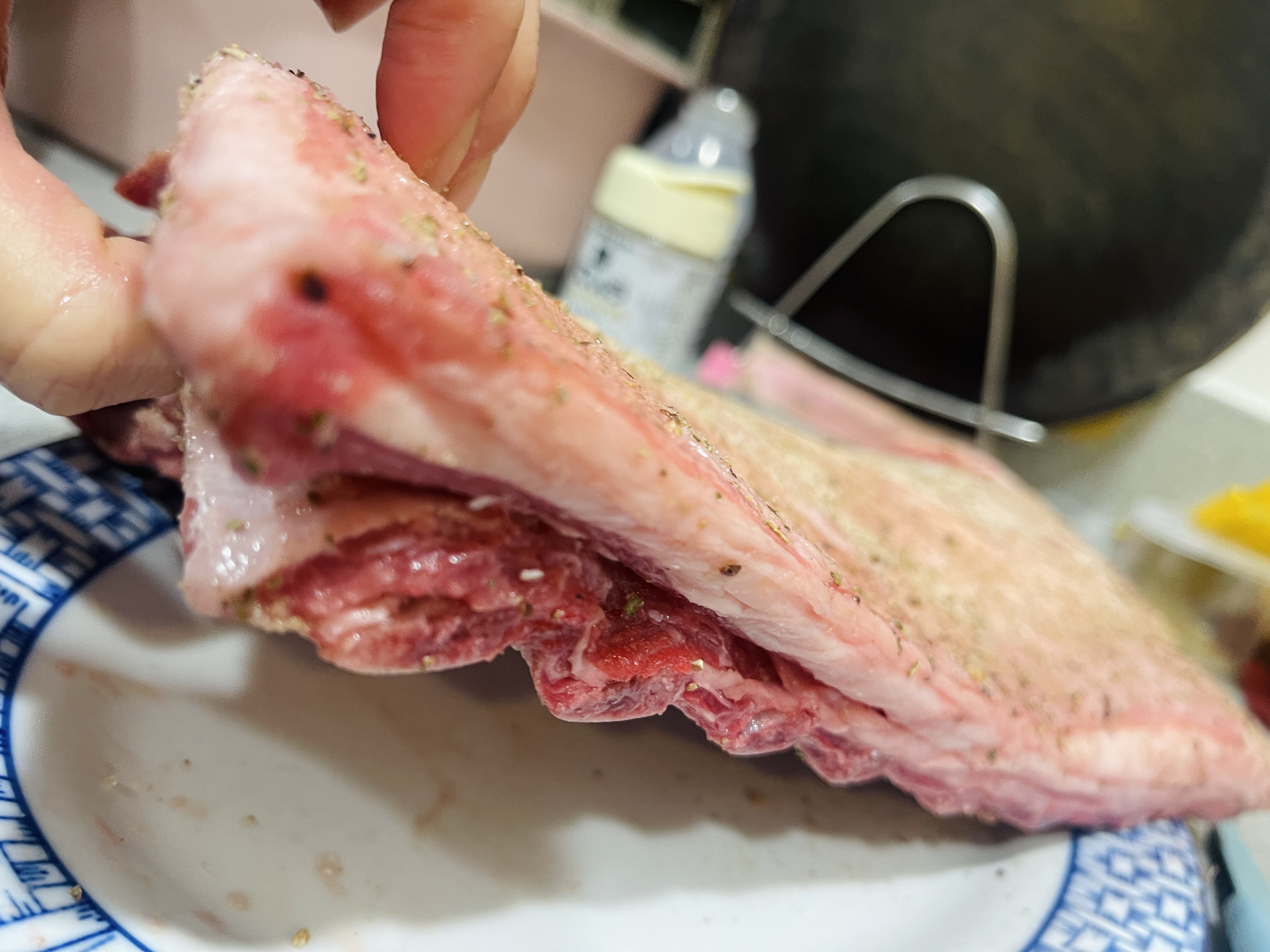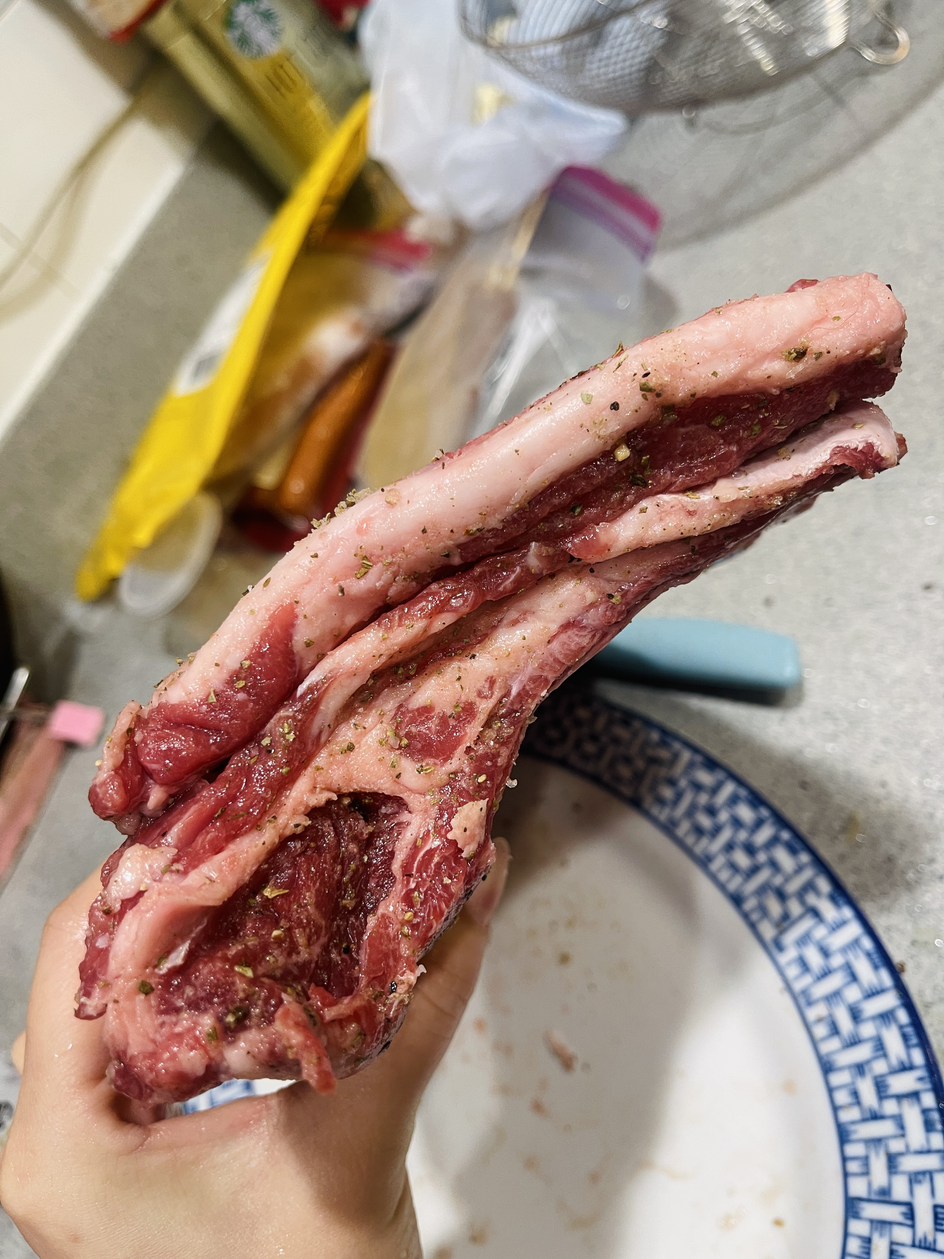 骨與骨之間平均切開,然後用少許花椒粉、孜然粉、海鹽同埋