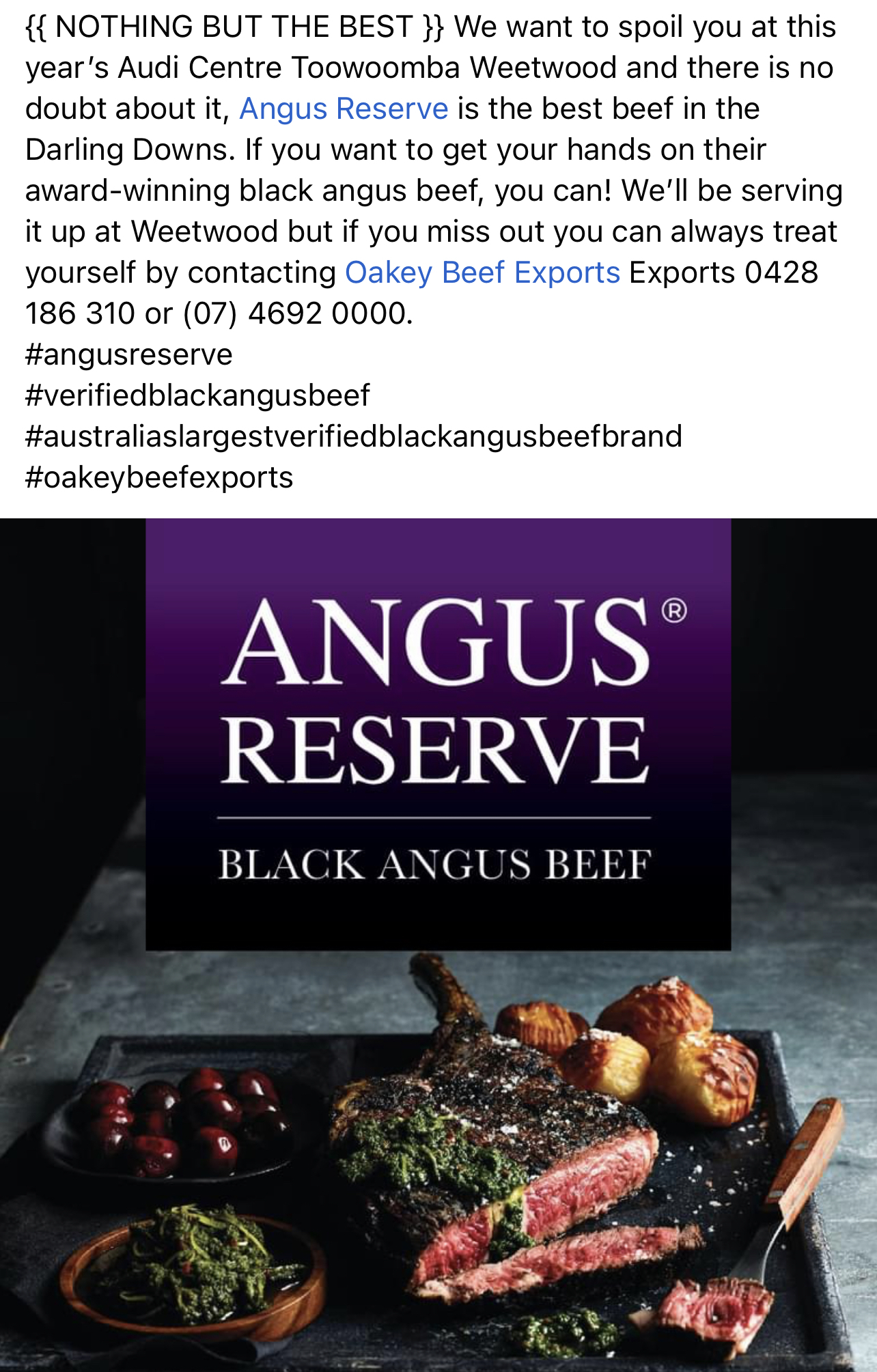 Oakey Angus reserve, 係澳洲當地一個餐廳好鍾意用嘅牌子,有啲餐廳係特登用呢個牌子嚟賣廣告吸引啲人嚟食嘅,而且佢哋嘅牛扒已經得過好多次獎項,餐廳嘅廣告話佢已經成為講個城中最出名嘅牛扒牌子