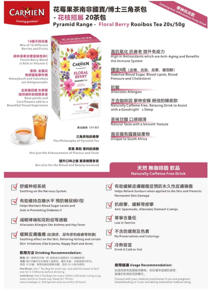 直接來自南非的Carmién 國寶茶 (Rooibos)始於1998年, 是最高質的有機紅灌木而且是根據公平貿易原則生產, 根據公平貿易原則生產。為了保持一致的質量和最佳的風味。從在田間種植產品到開發出最佳口味和風味的整個過程,均由嚴格的過程和措施控制, Carmien榮獲9項國際認證,並定期接受所有這些認證機構的審核。