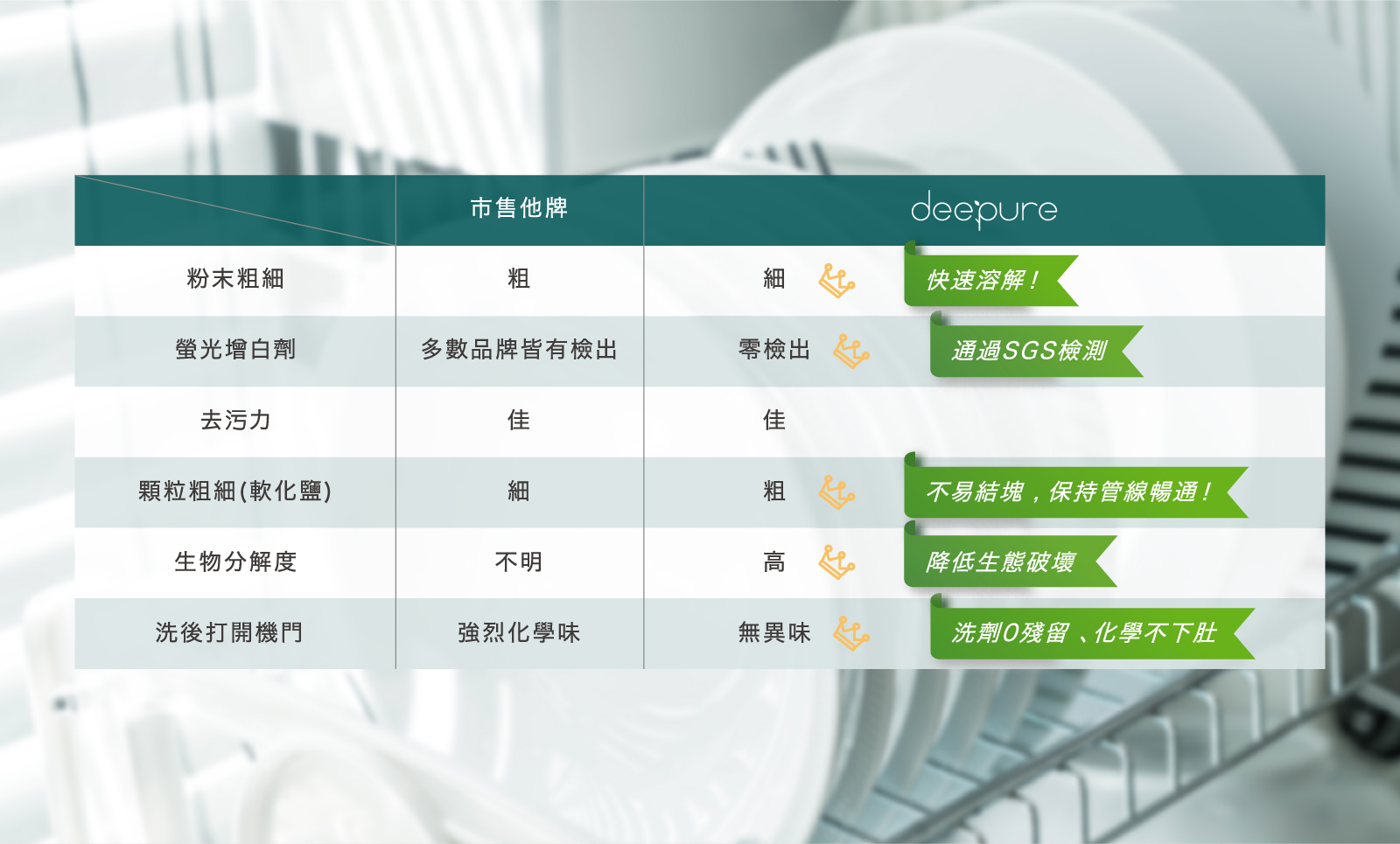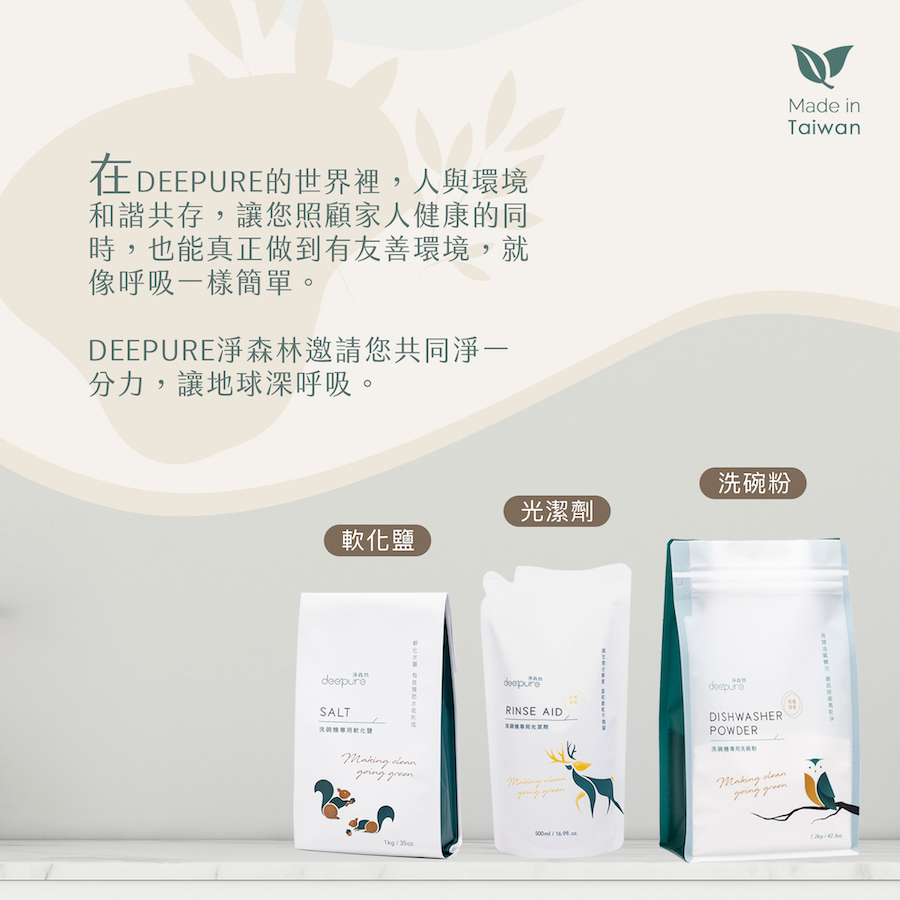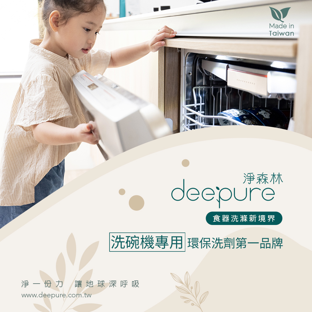 DEEPURE洗碗機洗淨系列,選用高生物分解度界面活性劑,不含螢光增白劑、甲醛、王酚、三氯沙、M/MCI防腐劑等有害物質,不但符合歐盟標準,更超越標準,守護全家人的健康。
