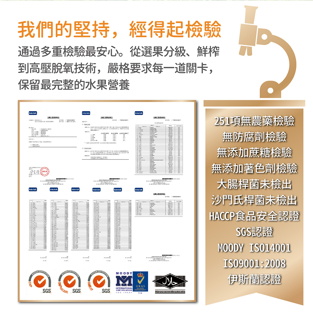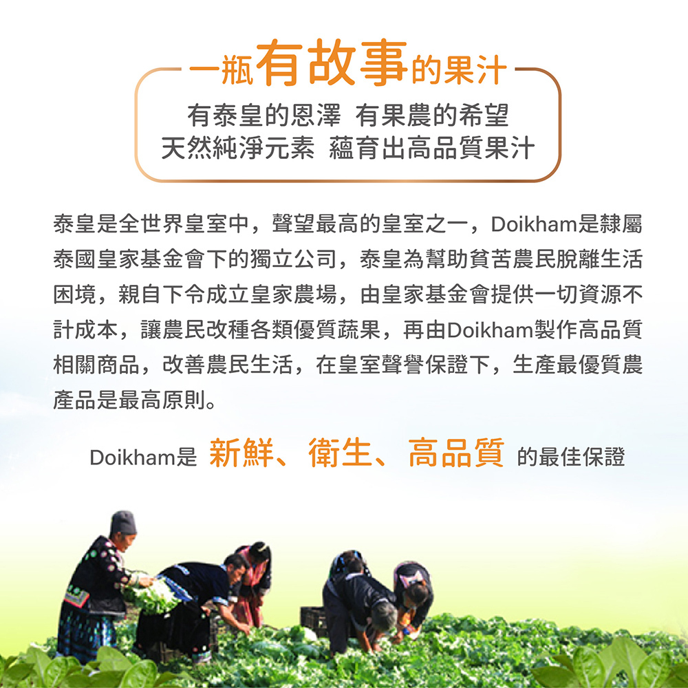 皇家農場鮮果汁,採用新鮮水果鮮榨原汁,完整保留新鮮水果的營養,非濃縮還原,不含防腐劑,無農藥,無添加物,無人造色素,具六大食品安全認證,