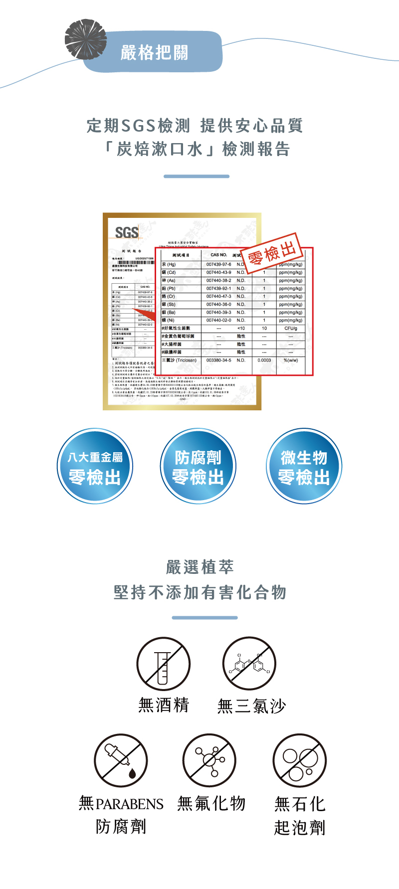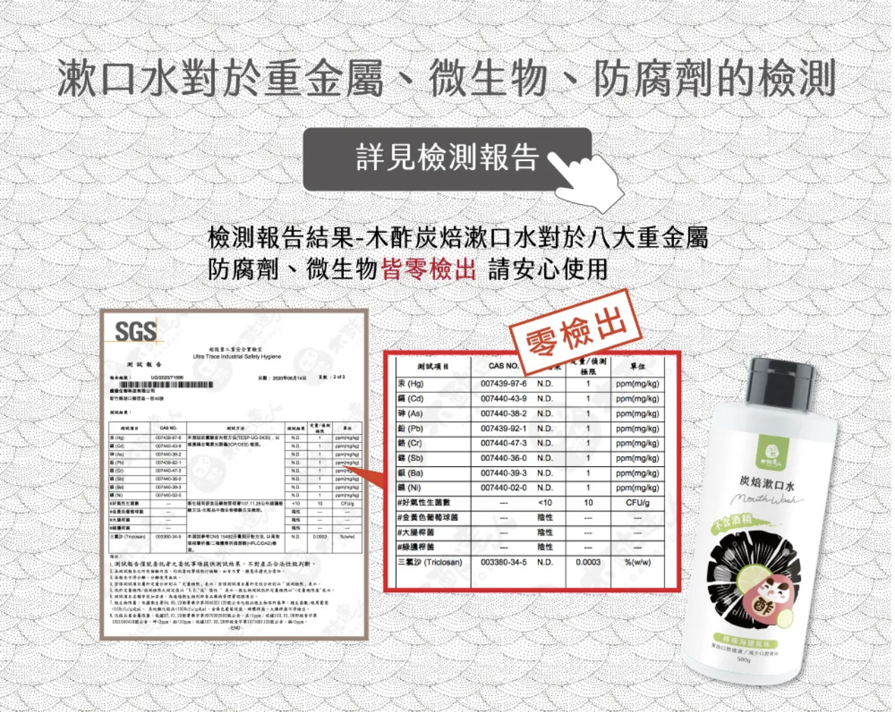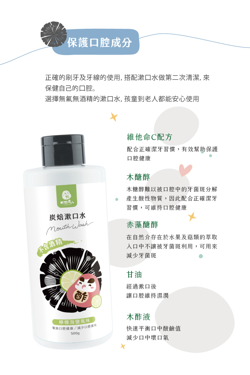 全成分:無菌水、木酢液、醫藥級(USP)甘油、1,3丙二醇(玉米澱粉衍生)、赤藻糖醇(Erythritol) 、木醣醇(Xylitol)、維他命C、食品級檸檬香料、草本甘草/薄荷萃取液、海鹽