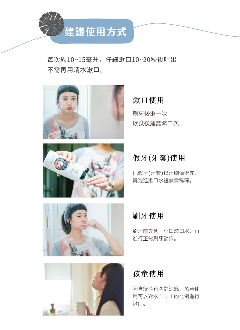 每次約10~15毫升,漱口10~20秒後吐出,不需再用清水漱口。