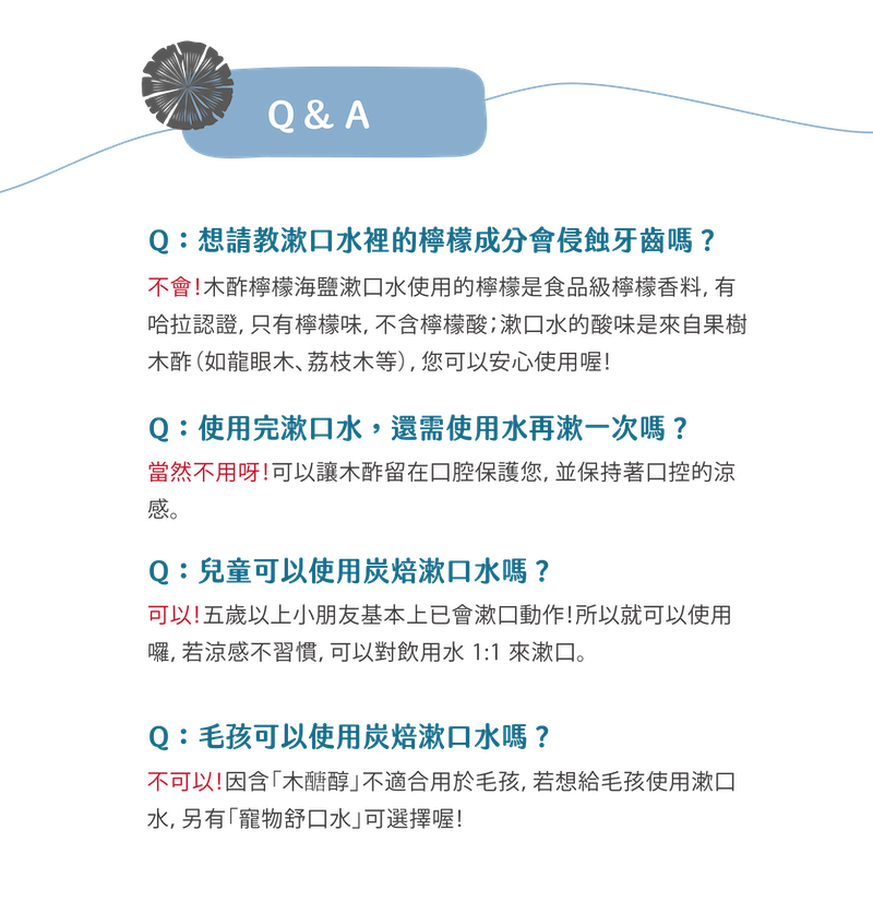 〈漱口水中含維他命C,保護受牙刷磨擦的牙齦。木醣醇及褐藻醣醇是減少牙菌斑的好成分,甘草萃取液在漱口後,提供回甘的感覺。〉