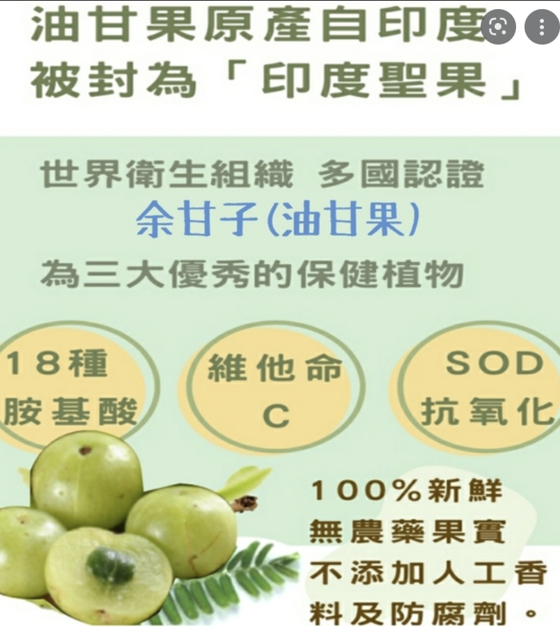1)古印度僧侶尊其為“印度聖果”。油甘子營養豐富,經分析,發現含有多種維生素(如:維生素B1、維生素B2、維生素C和胡蘿蔔素等,其中尤以維生素C含量高而著稱,平均含量是柑橘的100倍,蘋果的160倍),並已在許多國家廣泛用於改善頭髮和頭皮的健康。