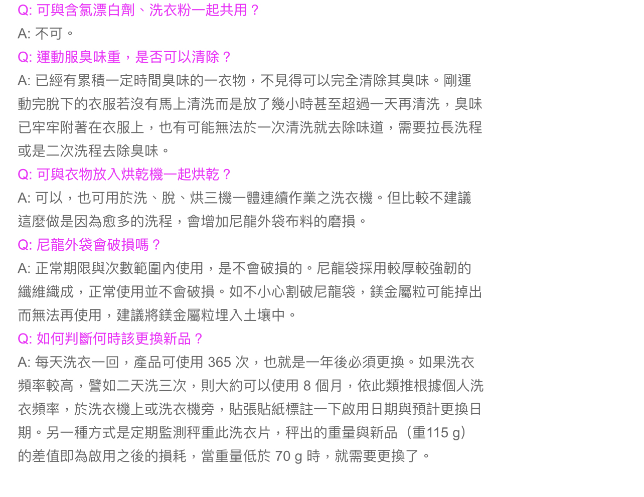 2. 利用鎂元素進行清潔,讓衣物更加乾淨、清新。不含任何香精及有害化學物質,且具有強大的除味作用。