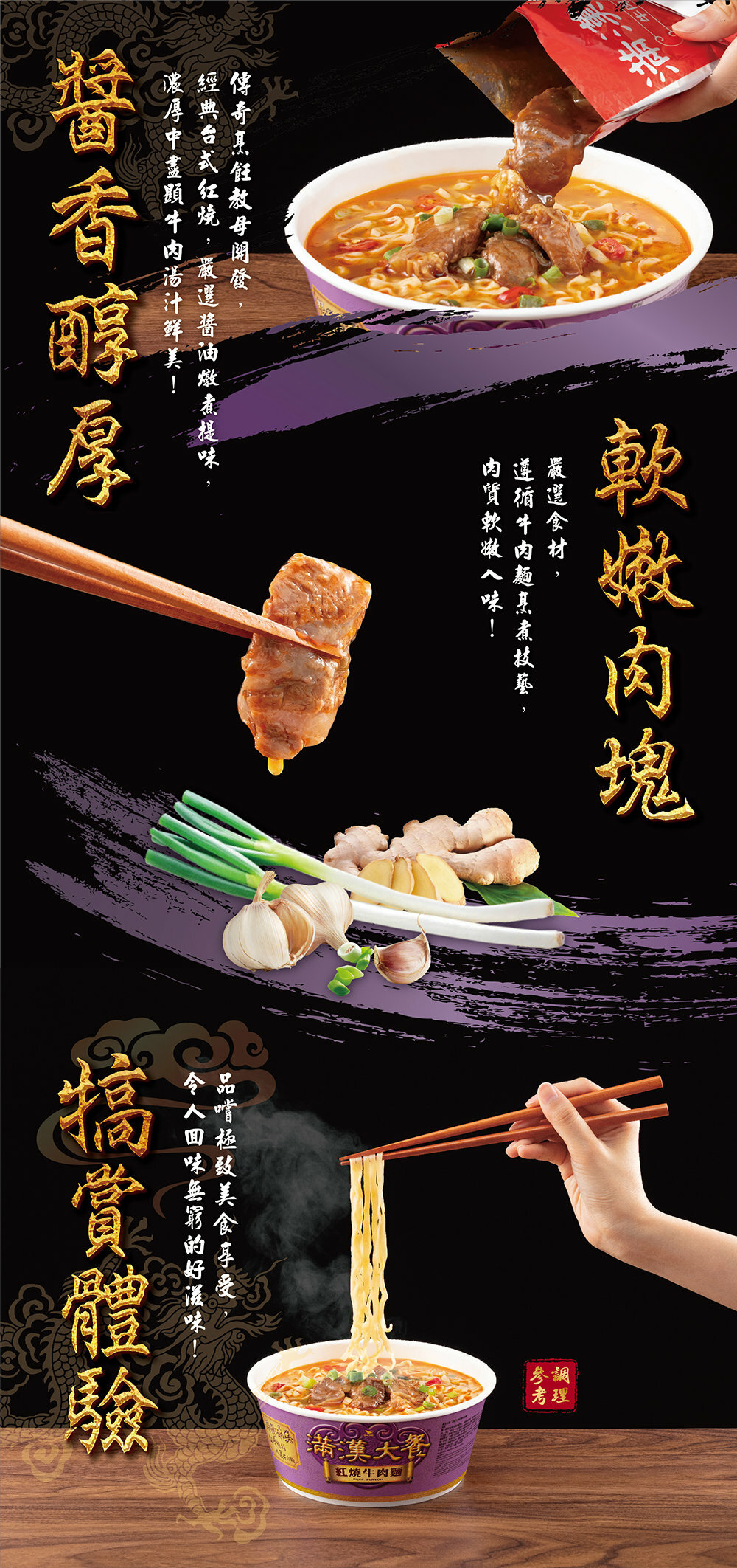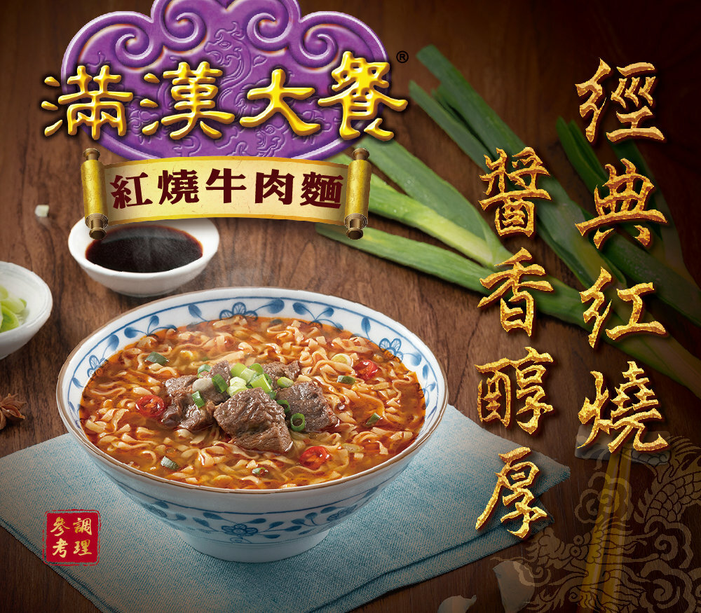 滿漢大餐麻辣鍋牛肉麵 麻辣鍋精華湯底,以濃厚的牛肉原湯與酒釀的甘甜味感相互調和,拉扯出嗆麻香辣、鮮美回甘的濃郁滋味!