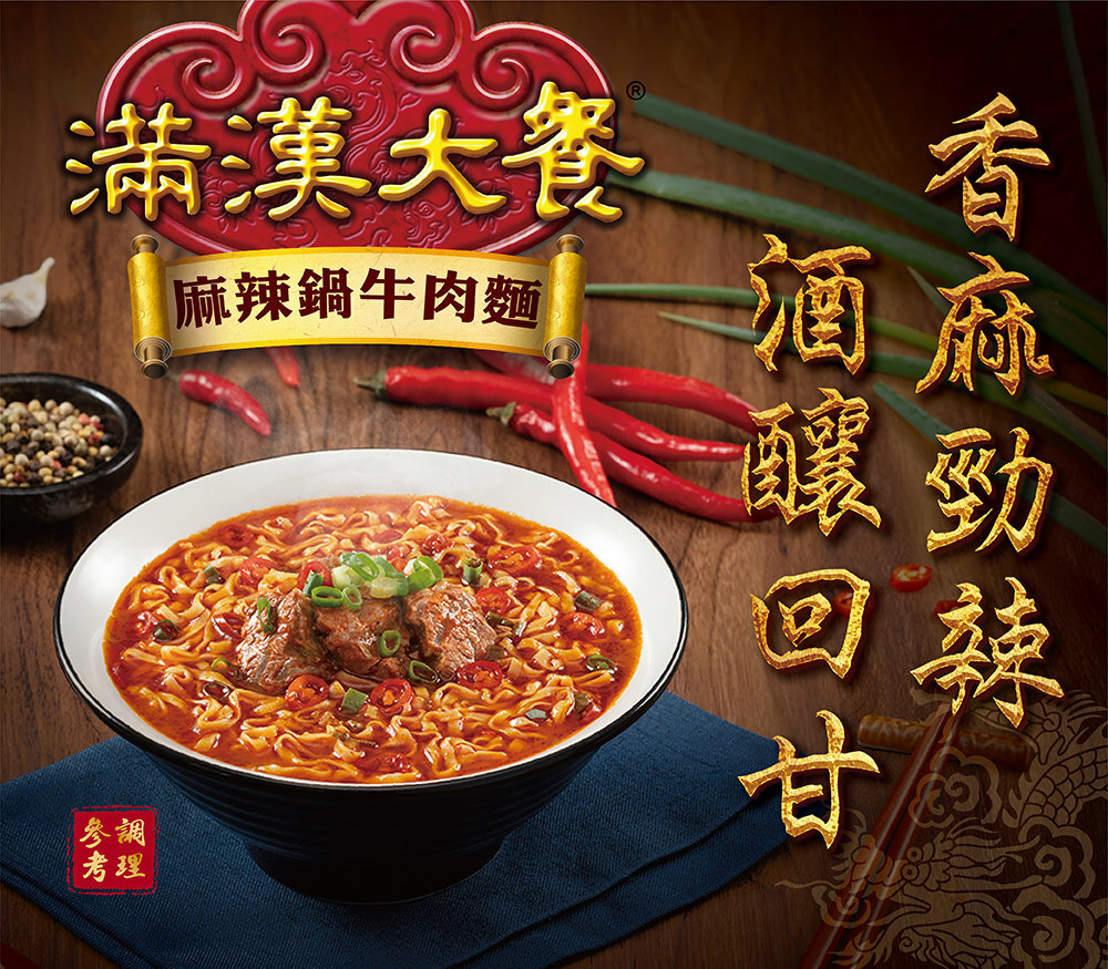滿漢大餐麻辣鍋牛肉麵 麻辣鍋精華湯底,以濃厚的牛肉原湯與酒釀的甘甜味感相互調和,拉扯出嗆麻香辣、鮮美回甘的濃郁滋味!