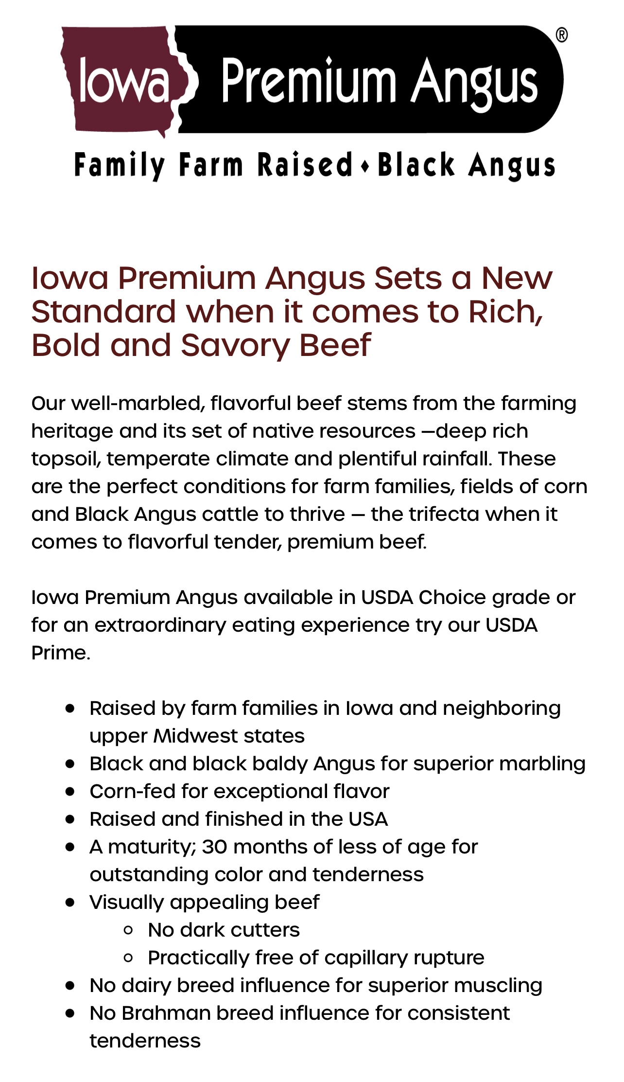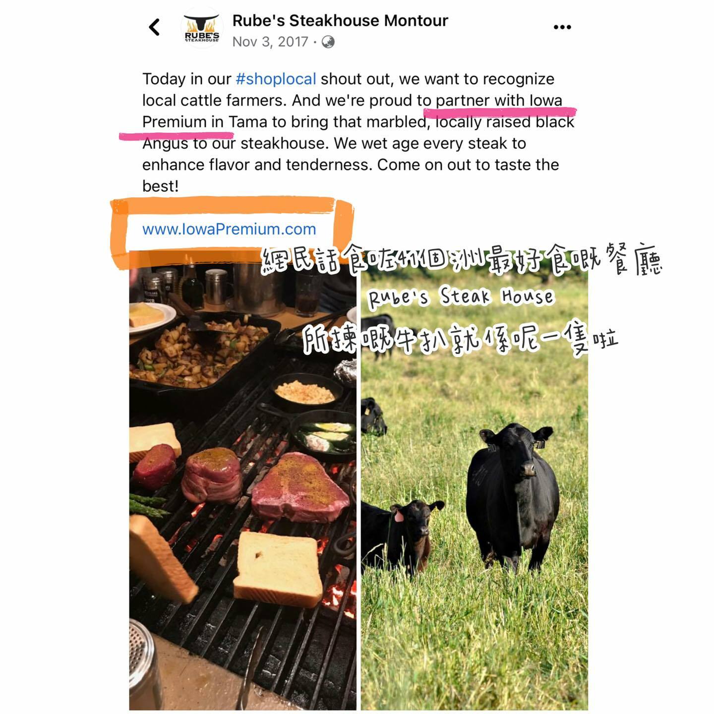 美國 Iowa premium beef 是一個家庭營運的農場,由飼料到驗貨、包裝都經人手小心處理。飼料是100%粟米! 油花平均,牛味又重!