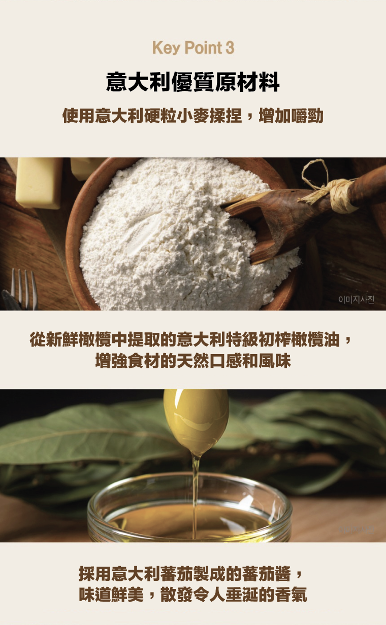 • 採用意大利硬粒小麥揉捏,增加嚼勁