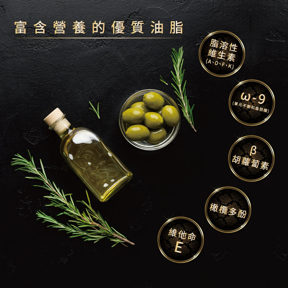 橄欖油營養價值也是最高的,含豐富的抗氧化成分、橄欖多酚、維生素、單元不飽和脂肪酸(Omega-9),可減少血液中的膽固醇含量,有助預防心血管疾病、癌症、糖尿病等。
