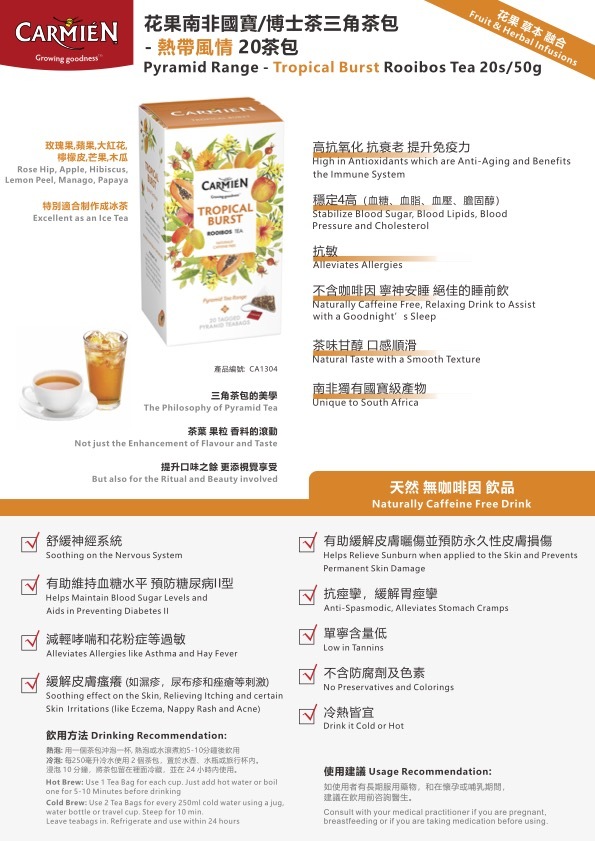 直接來自南非的Carmién 國寶茶 (Rooibos)始於1998年, 是最高質的有機紅灌木而且是根據公平貿易原則生產, 根據公平貿易原則生產。為了保持一致的質量和最佳的風味。從在田間種植產品到開發出最佳口味和風味的整個過程,均由嚴格的過程和措施控制, Carmien榮獲9項國際認證,並定期接受所有這些認證機構的審核。