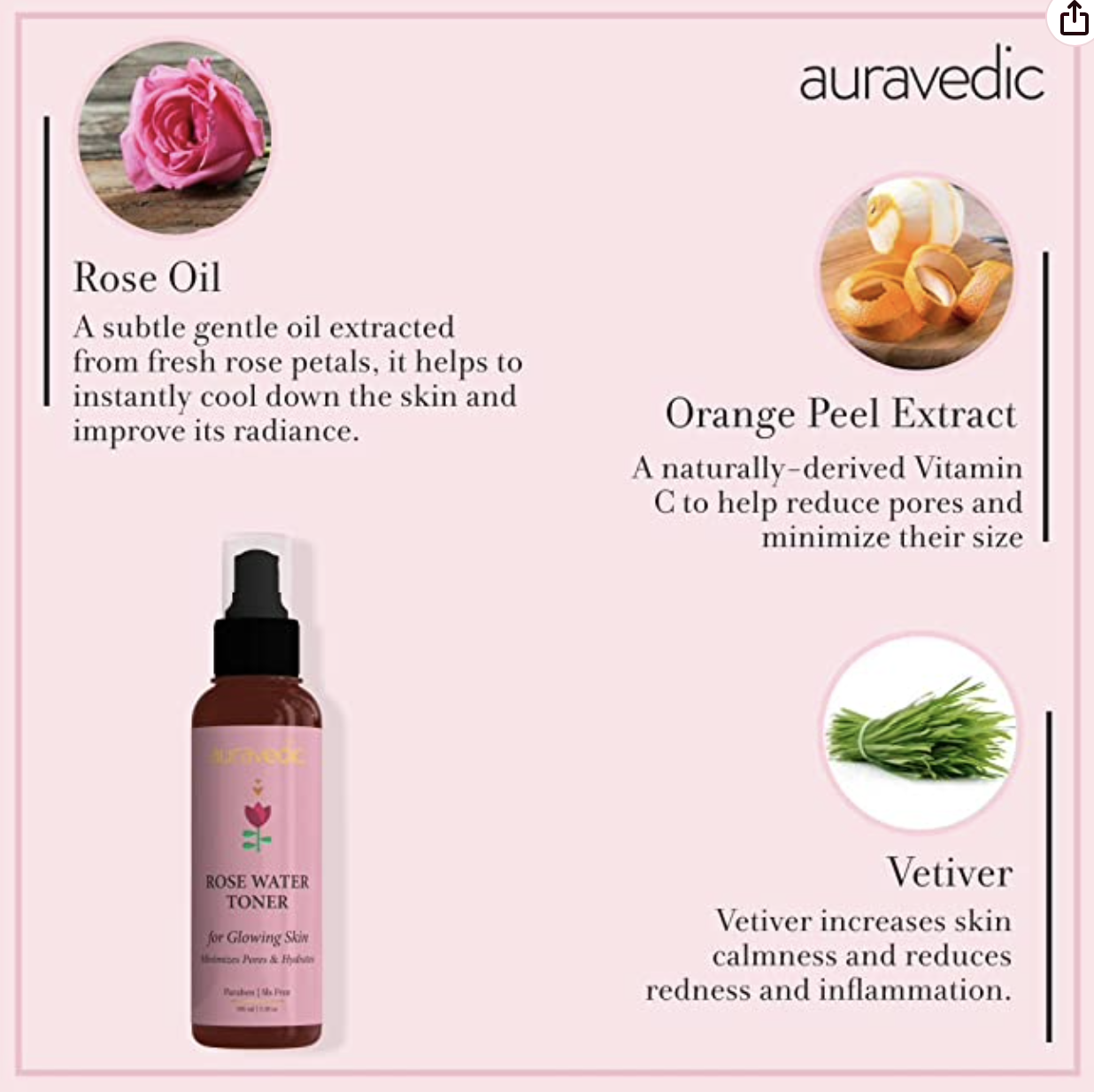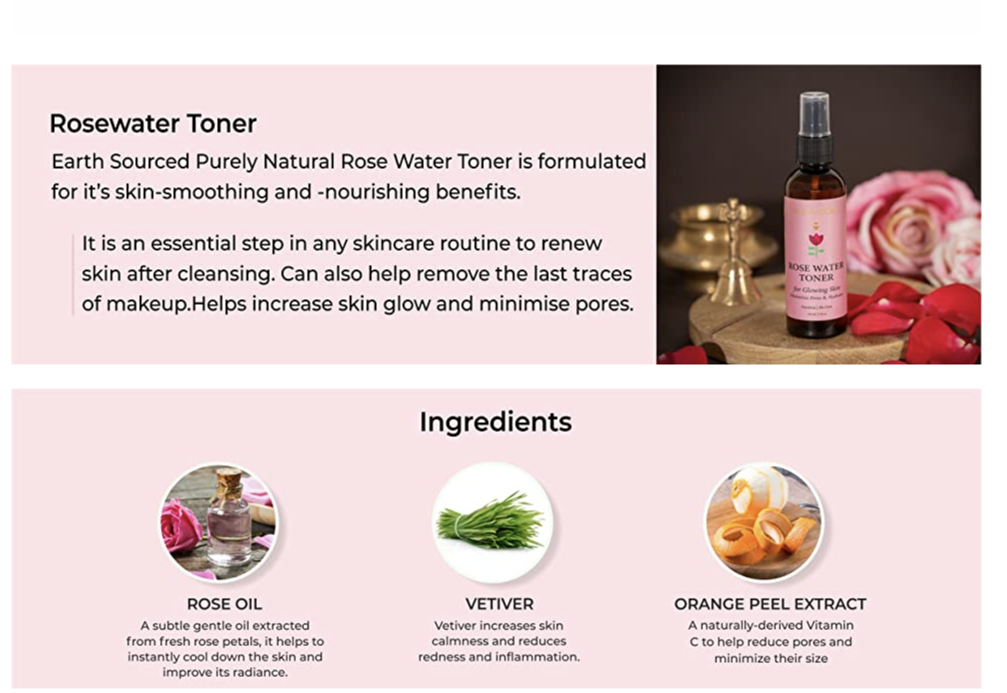 Earth Sourced Purely Natural Rose Water Toner is formulated for it’s skin-smoothing and -nourishing benefits. It is an essential step in any skincare routine to renew skin after cleansing. Can also help remove the last traces of makeup.Helps increase skin glow and minimise pores.