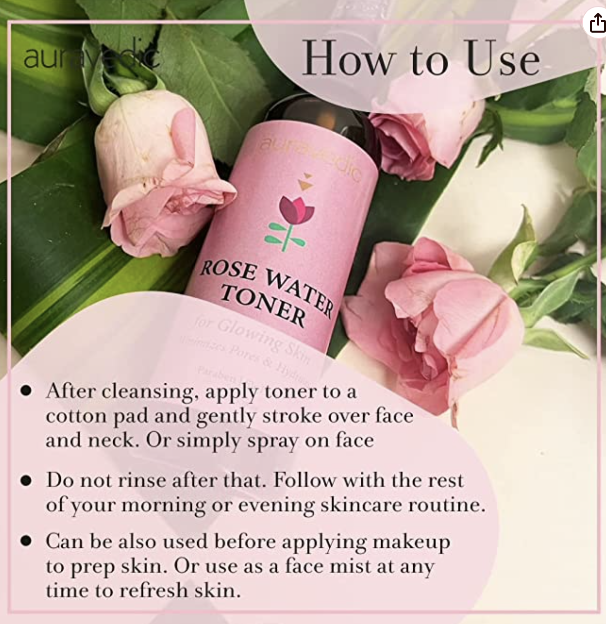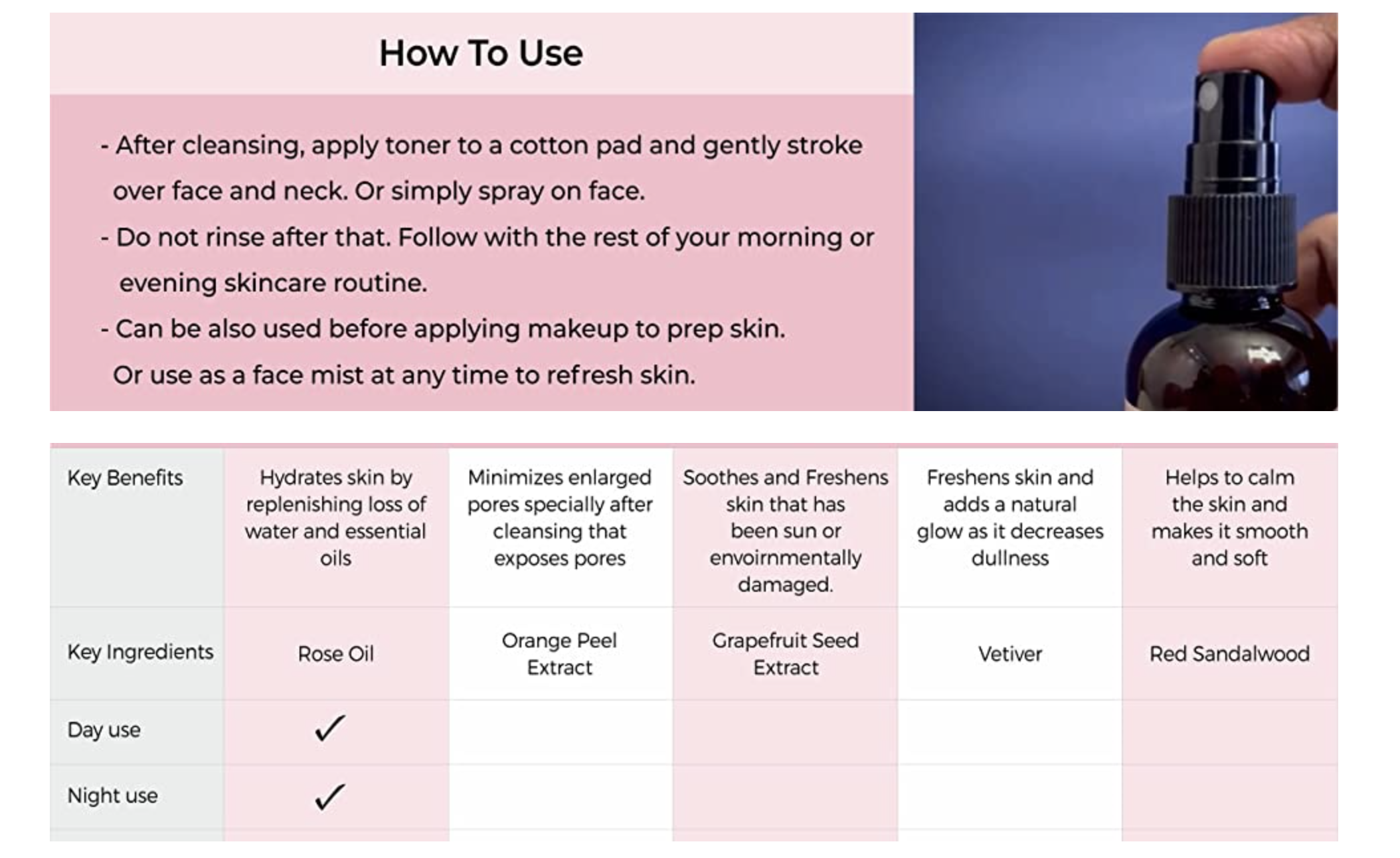 After cleansing, apply toner to a cotton pad and gently stroke over face and neck. Or simply spray on face Do not rinse after that. Follow with the rest of your morning or evening skincare routine.