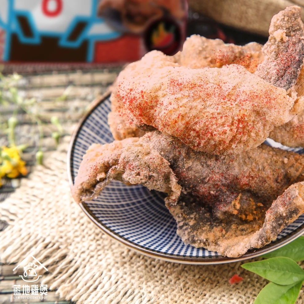 經過反覆研發,將自家製作的手工炸魚皮變成更方便的包裝,令大家享用雞煲時免受忘記預備魚皮之苦,亦成為大家的零食良伴。藍地雞煲的手工炸魚皮,不僅是手工製作,還使用了獨特的配方,讓每一片魚皮吃起來都香氣四溢,而且特別酥脆。