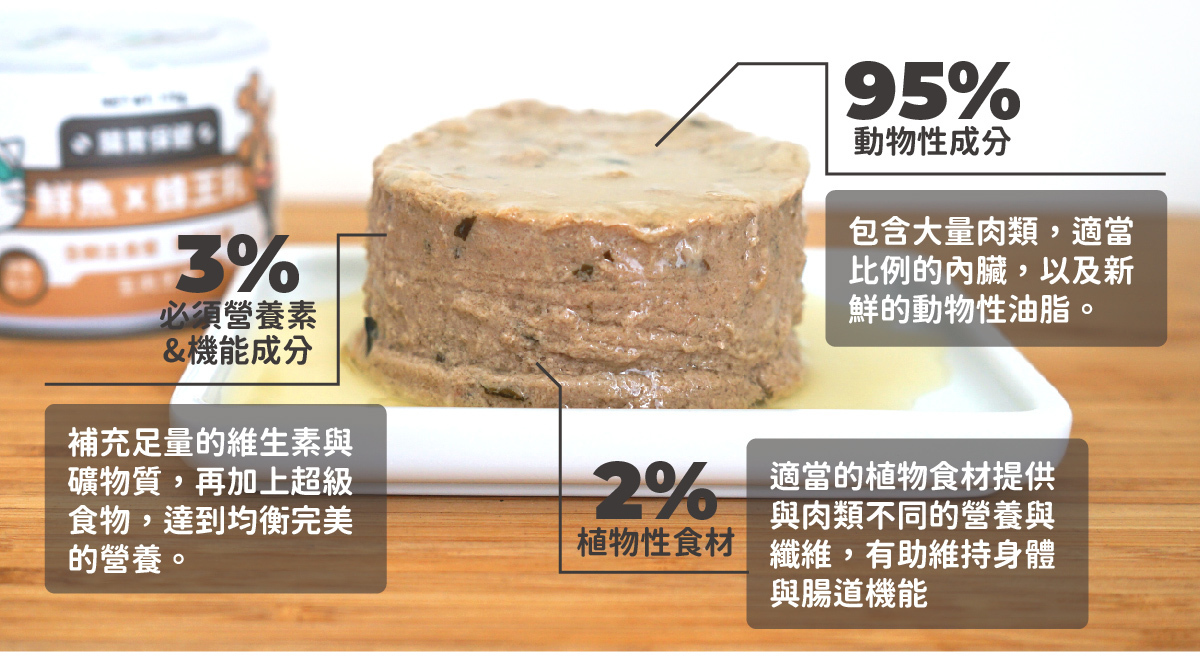 ◆ 適合貓貓的黃金比例:95%動物性食材+2%植物性食材+3%必需營養素&超級食物