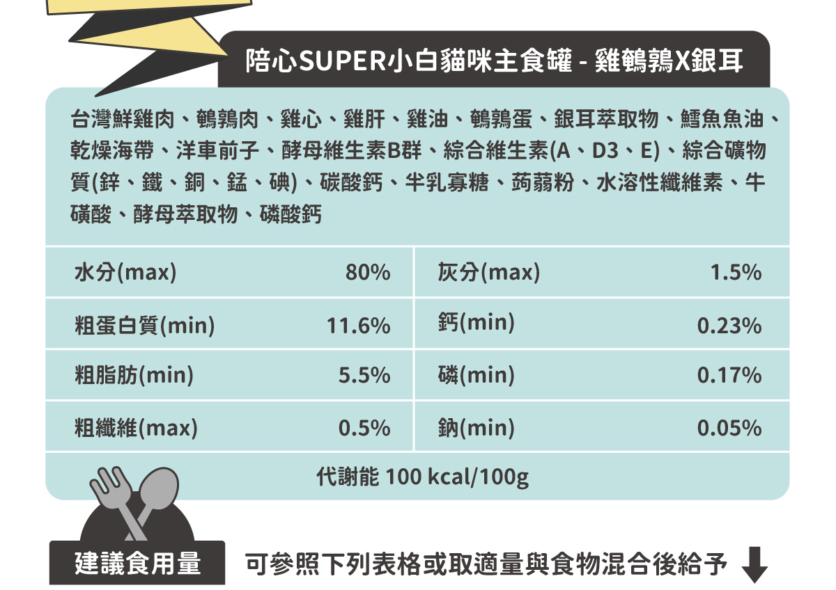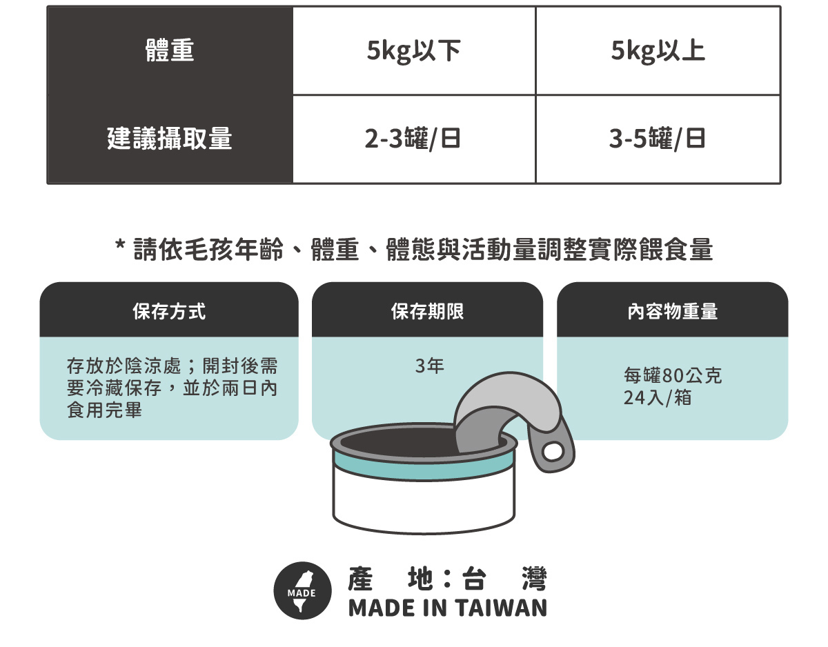 注意:以上係細罐裝80g嘅指引,另外我哋都有買大罐裝170g自己可以按返貓貓嘅重量比例去餵食食