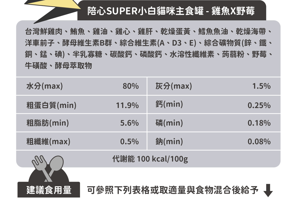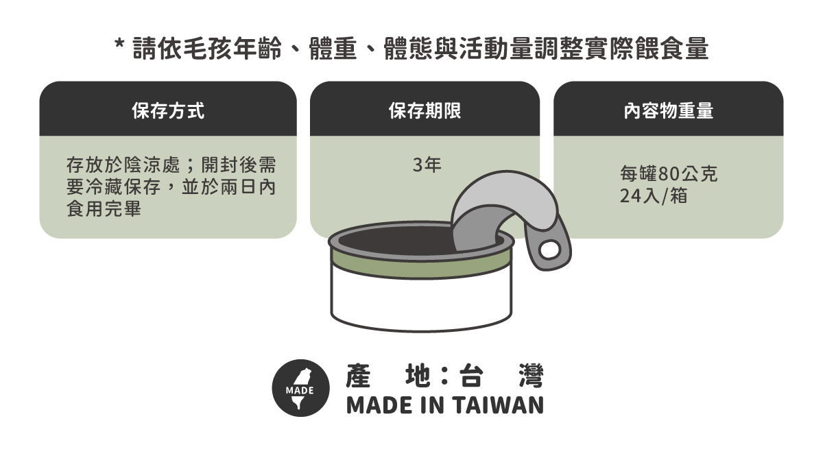 注意:以上係細罐裝80g嘅指引,另外我哋都有買大罐裝170g自己可以按返貓貓嘅重量比例去餵食食