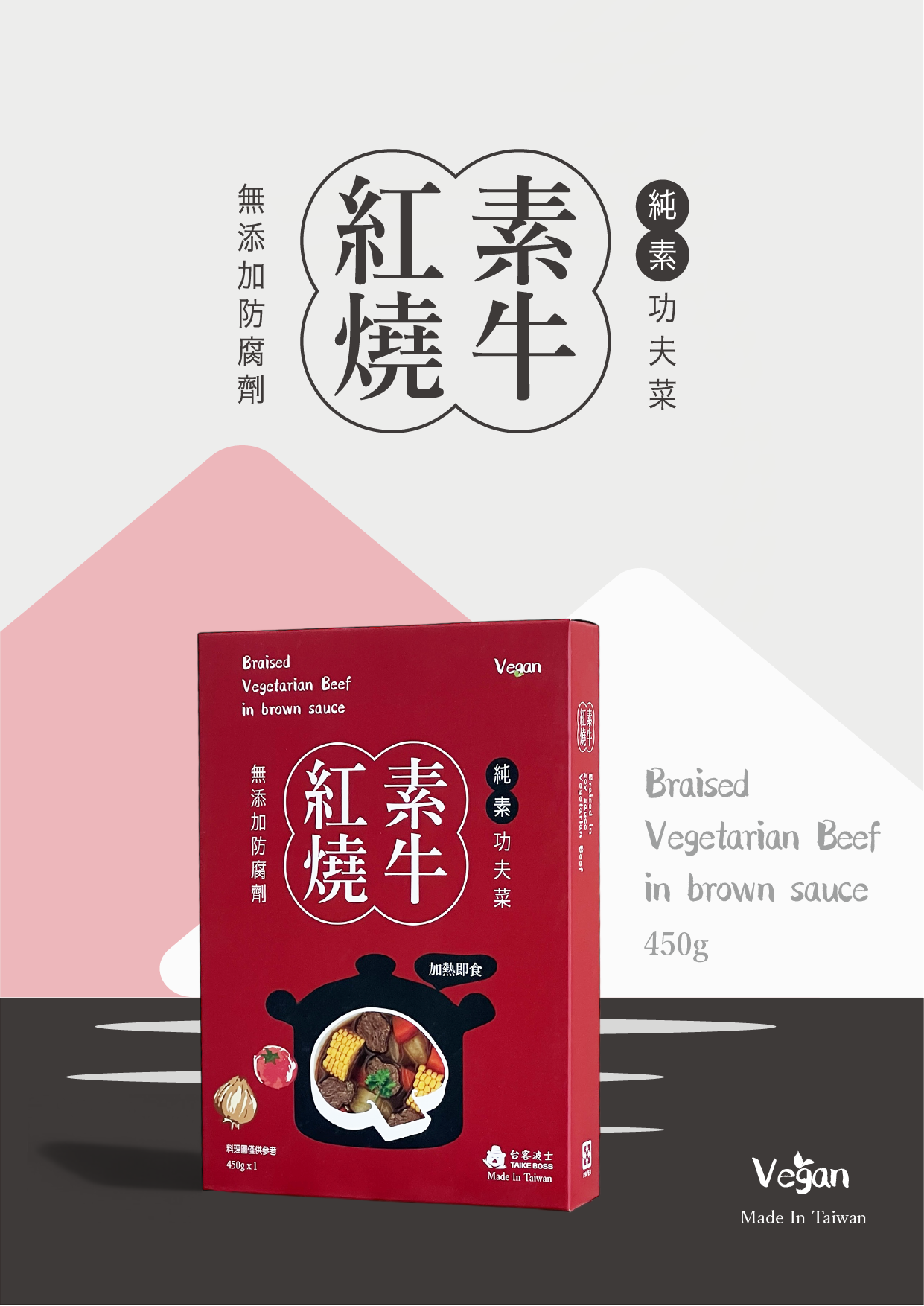 採多款天然辛香料及各式特色醬料採細火慢熬煮精燉而成的紅燒湯底,細火精燉仿牛肉組織的蔬植牛肉片