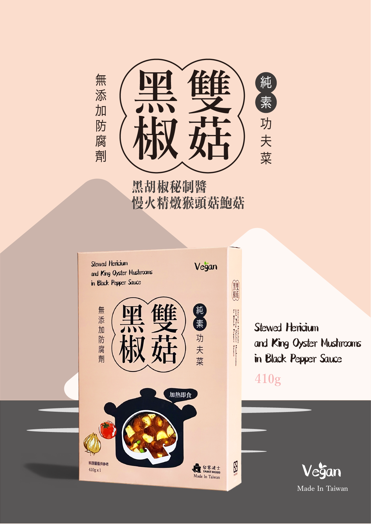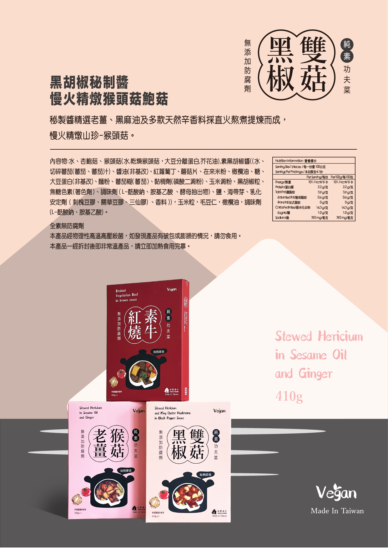 秘製醬精選老薑、黑麻油及多款天然辛香料採直火熬煮提煉而成,慢火精燉山珍-猴頭菇。