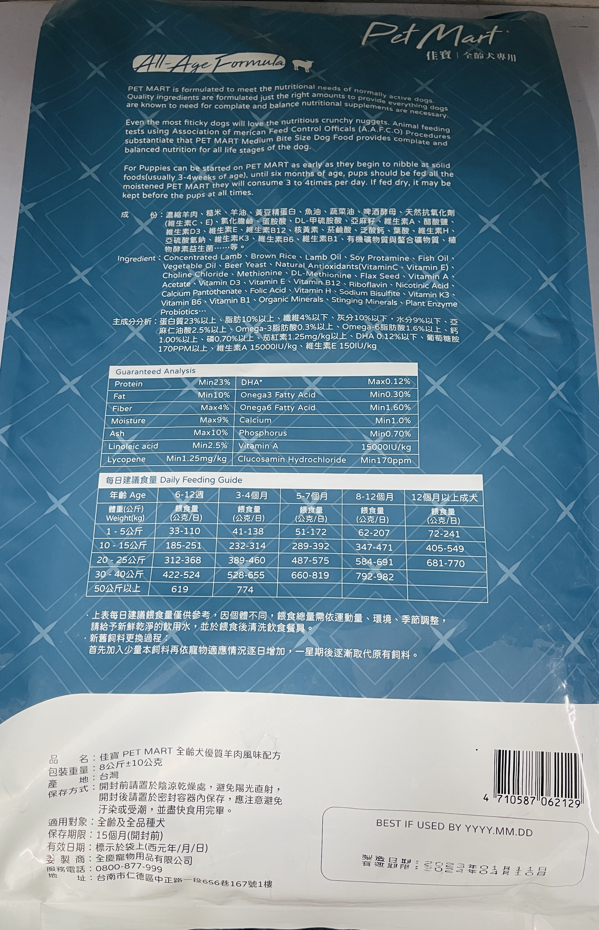 成份:濃縮羊肉、糙米、羊油、黃豆精蛋白、魚油、華菜油,啤酒酵母、天然抗氧化劑(維他命C、E)、亞麻籽、維他命A、維他命D3、維他命E、維他命B12、核黃素、菸鹼酸、乏酸鈣、葉酸、維他命H、